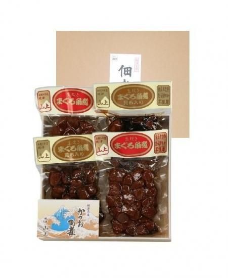 化学調味料・食品添加物なし生炊き「まぐろ角煮」の醤油を地元製造の丸大豆醤油にグレードアップし北海道産の昆布を「まぐろ角煮」同様化学調味料・食品添加物なしの味に仕上げコラボした「まぐろ角煮昆布入」と丸大豆醤油を使用した「鮪角煮」をセットにした鮪角煮の商品です。