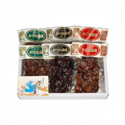 古く天平時代(西暦730年頃)から美味なるものとして喜ばれ愛されてきた鰹を、焼津の伝統製法を生かし「かつお角煮」として香り豊かな逸品に創りあげました。調味も化学調味料、食品添加物は使わず地元丸大豆醤油と粗糖だけのシンプルな甘辛味に仕上げてあります。