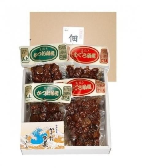 ◆新商品:まぐろ角煮浜しぐれ かつお角煮浜しぐれ  食の工業化が進み化学調味料、食品添加物を多用した多種多様な加工食品が増えております。同時にかつてはなかったアレルギー疾患や生活習慣病などに悩まされる時代にもなりました。そんな中当店の焼津伝統製法・生炊き「かつお角煮」「まぐろ角煮」は化学調味料、食品添加物を使わぬ伝統製法を踏襲した角煮です。調味も地元醤油と砂糖、生姜(生姜)のシンプルナ甘辛味に仕上げてあり、かめば程よい歯応えと一粒一粒より広がる鰹、鮪の旨みを楽しめ、お勧めです。 また堅さを気になさる小さなお子様やお年寄りの方の召し上がり方は次の⇒を参照下さい。 食べ方 ⇒動画/おにぎらず(おにぎり)